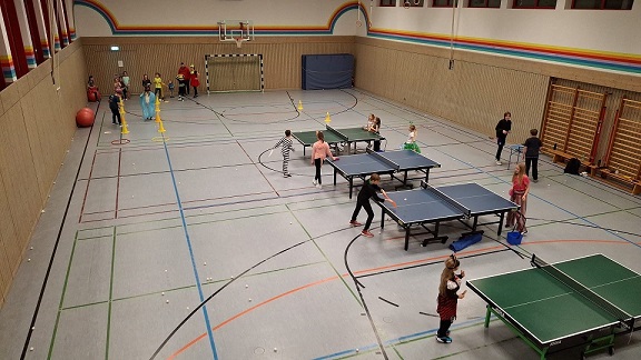 Und alle wollten Tischtennis spielen?!?! Doch oh Schreck! Nicht mal richtige Schläger waren vorhanden. Mit einem Teller, einer PC-Tastatur, einer Bürste, einem Buch, einer Fliegenklatsche und weiteren Dingen probierten sich die Sportler*innen an der Platte. Daneben wurde ein kleiner Schlittschuh-Parcour aufgestellt und um die Wette gefahren.