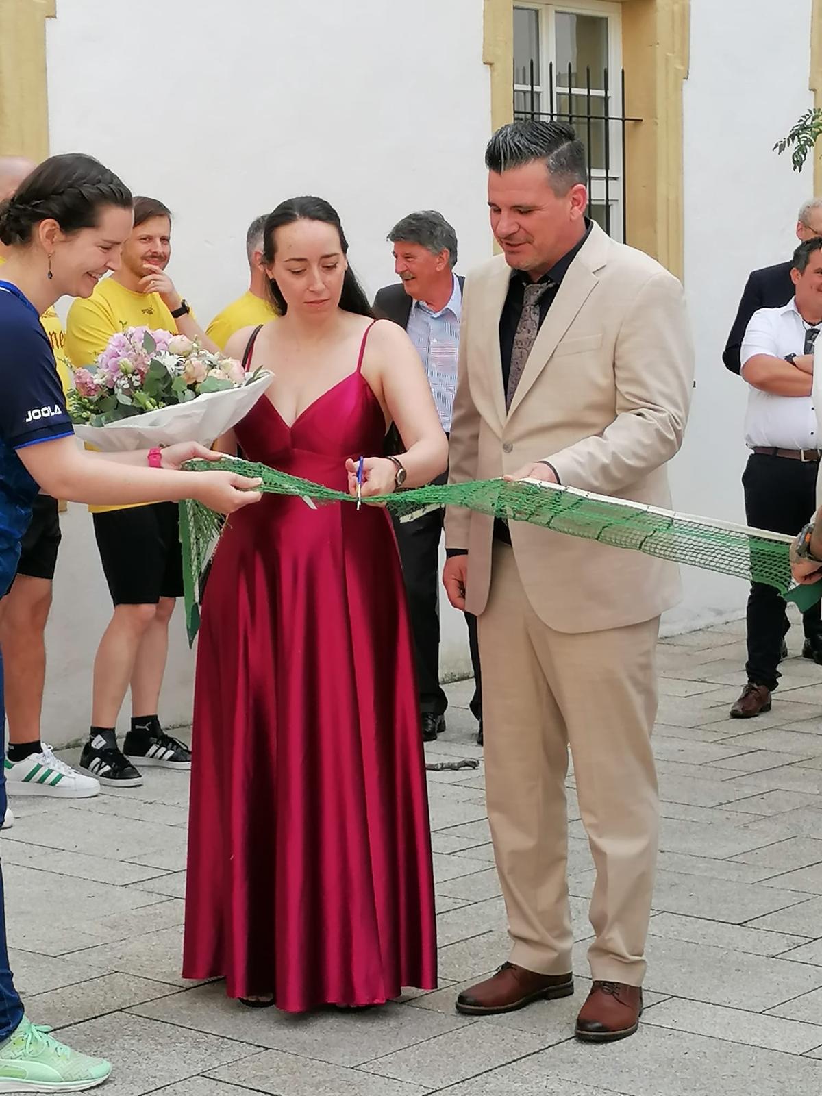 Zum Startschuss ins Eheleben und der gemeinsamen Zukunft wünschen wir den beiden viele gemeinsame Siege, keine Verlängerungen bei Diskussionen und immer genug Teamgeist. Natürlich mussten auch Andrea und Armin nach alter Tradition „das Netz“ durchschneiden, um zu den weiteren Feierlichkeiten zu gelangen. Dies haben die beiden mit Bravur und linker Hand gemeistert.