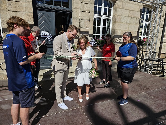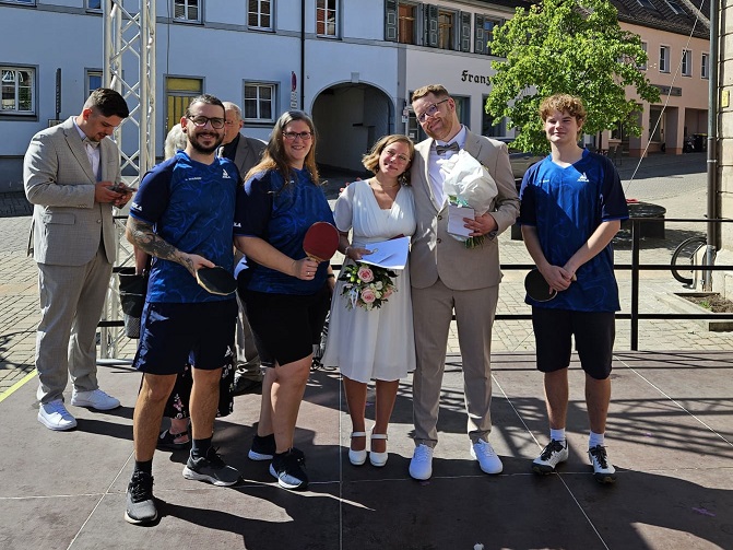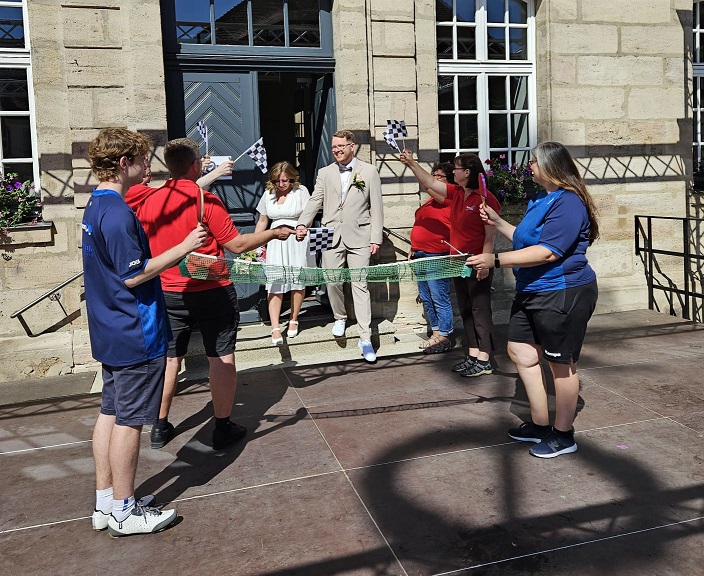 Als Tischtennisabteilung standen wir Spalier und wünschten dem Brautpaar alles erdenklich Gute für die gemeinsame Zukunft. In guter Vereinstradition durfte das frisch vermählte Paar beim Durchschreiten unseres Spaliers ein altes Tischtennisnetz durchschneiden – ein sportlich-symbolischer Start in ihren neuen Lebensabschnitt.
