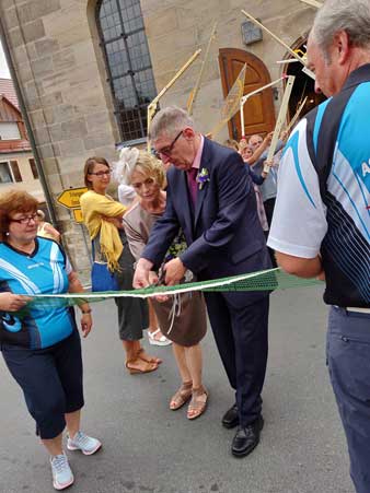 Auch Evi und Roland kamen, wie alle ihre "Vorgänger" der alten Tischtennistradition nach, das "Tischtennisnetz" zu zerschneiden. Die beiden luden alle Spaliersteher zu einem kleinen Imbiss in die "Brennerei-Stuben" ein.