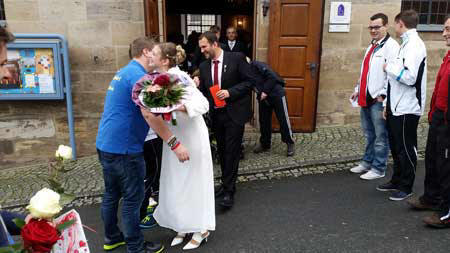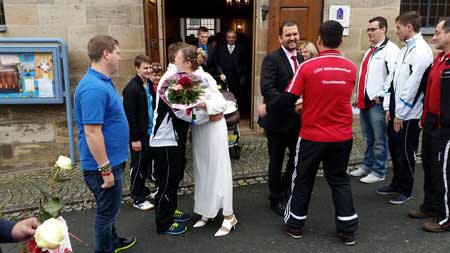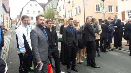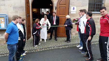 Viele Tischtennisler waren eingeladen und einige waren gekommen, um die Glückwünsche des ASV zu überbringen. Die beiden mussten traditionsgemäß ein Tischtennisnetz zerschneiden, um ihren Weg zu den Feierlichkeiten fortsetzen zu können.