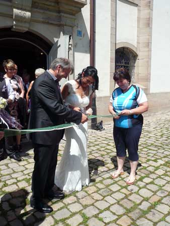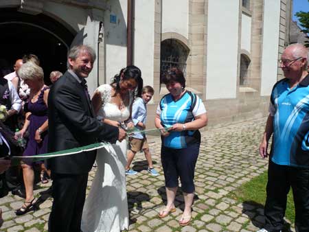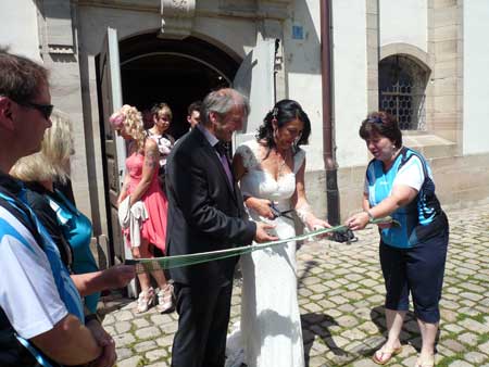 Viele Kameraden aus dem Sportbereich Tischtennis waren eingeladen und einige waren gekommen, um die Glückwünsche der ASV'ler zu überbringen. Tina und Joe mussten - wie schon ihre Vorgänger - traditionsgemäß ein Tischtennisnetz zerschneiden, um ihren Weg zu den Feierlichkeiten fortsetzen zu können.