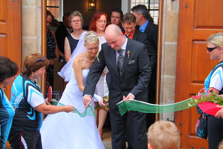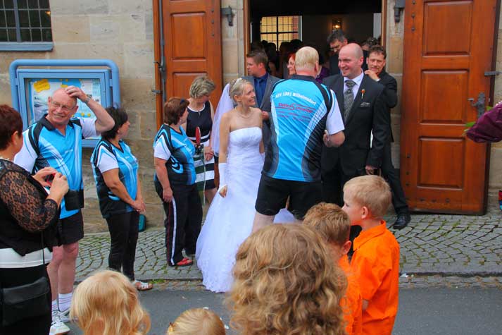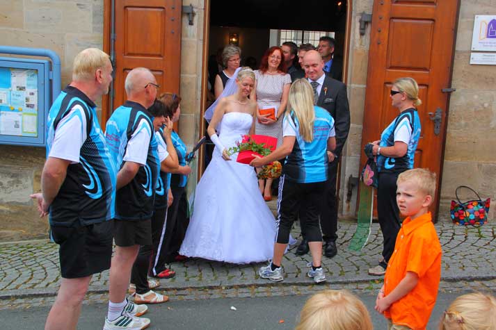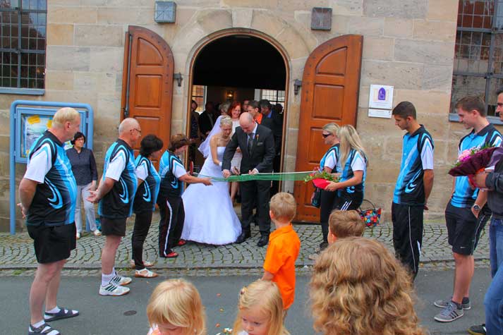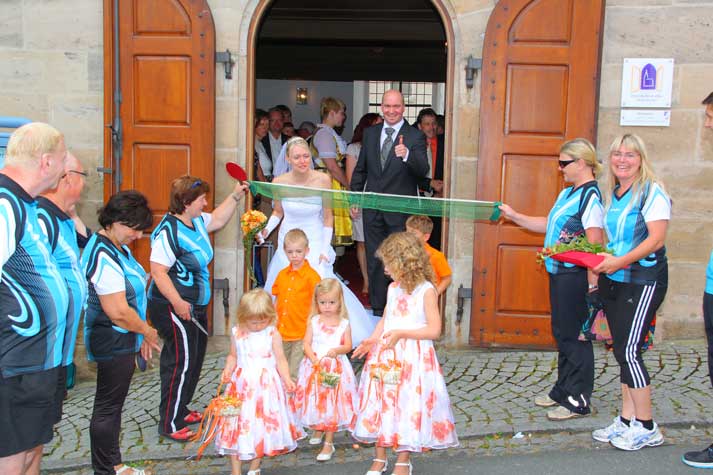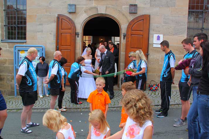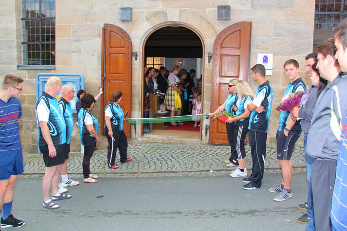 Beide sind seit einem Jahr im Sportbereich Tischtennis aktiv, wobei Simone gleich im Beirat Verantwortung übernommen hat. Sowohl die Tischtennisler als auch die Fußballer, bei denen Paul lange Zeit aktiv war und noch ist (Alte Herren) ließen es sich nicht nehmen, bei ihren Sportkameraden Spalier zu stehen.