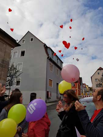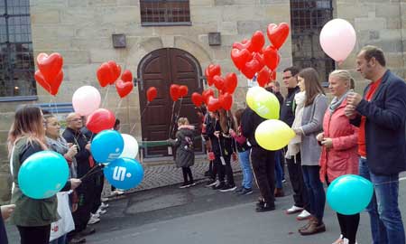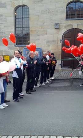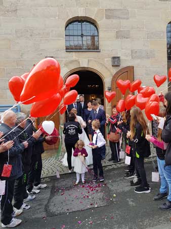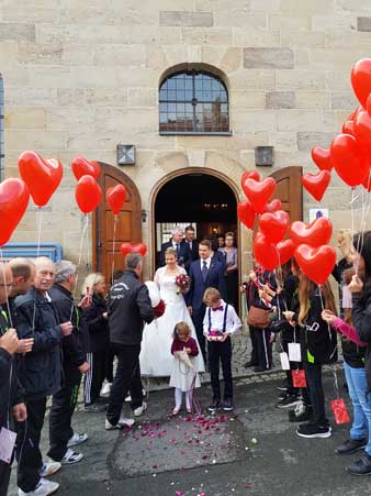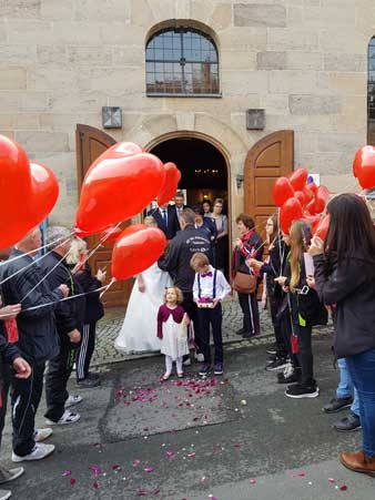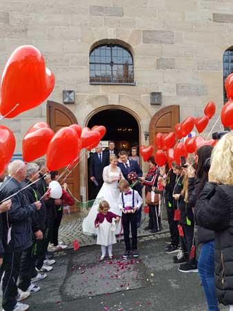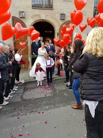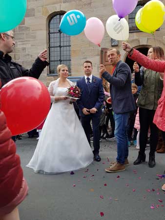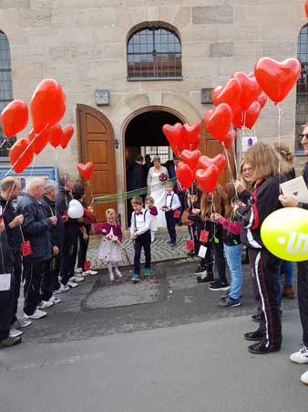 Viele Freunde aus dem Sportbereich Tischtennis waren eingeladen und noch mehr waren gekommen, um dem Brautpaar zu Ehren Spalier zu stehen und die Glückwünsche der ASV'ler zu überbringen. Nachdem Carina der alten TT-Tradition, ein Tischtennisnetz zu zerschneiden, nachgekommen war, ließ man noch viele Luftballons steigen, die die Botschaft der Hochzeit überall hin weiter tragen sollen.