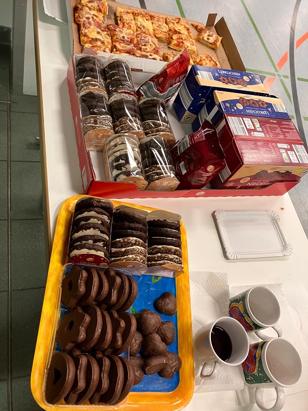 Wir machten lustige Spiele und bauten eine große Platte auf! Für das leibliche Wohl wurde reichlich gesorgt: Pizza, Lebkuchen und Punsch 😋