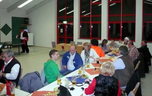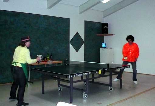 Nun wollte man heuer wieder mal einen Versuch wagen. Um es vorwegzunehmen, es war ein gelungener Abend. Zirka 30 ASV-ler aus allen Sportbereichen hatten sich eingefunden, um mit teilweise recht skurilen "Schlägern" ein kleines Tischtennisturnier auszutragen. Unter den Schlägern fand man z.B. einen Sieb, ein Physikbuch, ein Plastikschwert, eine Leberwurstdose, ...