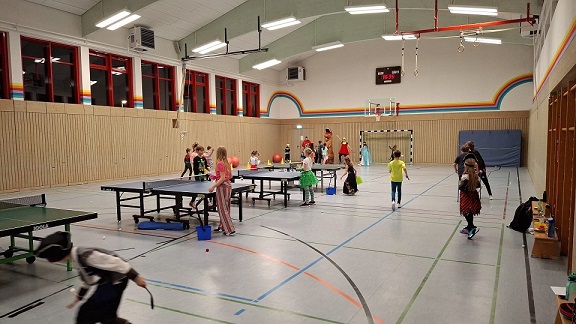 Und alle wollten Tischtennis spielen?!?! Doch oh Schreck! Nicht mal richtige Schläger waren vorhanden. Mit einem Teller, einer PC-Tastatur, einer Bürste, einem Buch, einer Fliegenklatsche und weiteren Dingen probierten sich die Sportler*innen an der Platte. Daneben wurde ein kleiner Schlittschuh-Parcour aufgestellt und um die Wette gefahren.