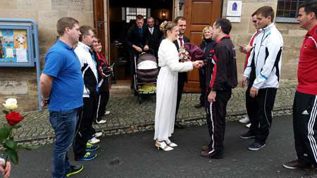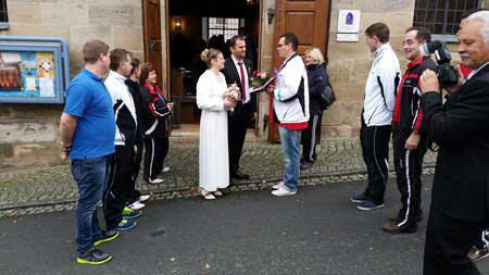 Viele Tischtennisler waren eingeladen und einige waren gekommen, um die Glückwünsche des ASV zu überbringen. Die beiden mussten traditionsgemäß ein Tischtennisnetz zerschneiden, um ihren Weg zu den Feierlichkeiten fortsetzen zu können.