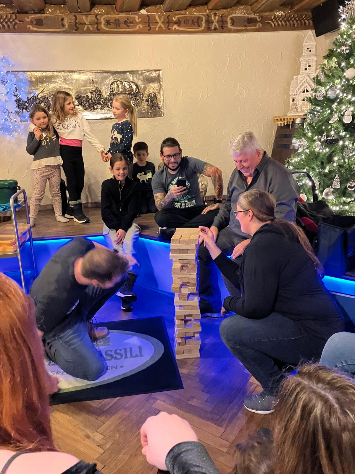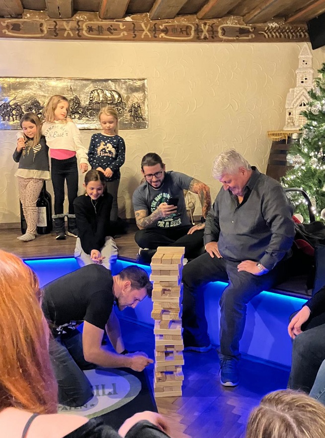 Insgesamt wurden vier Runden gespielt. Eine Runde bestand aus drei Fragen zu den Kategorien Tischtennis, Sport und Wilhelmsdorf und einem Geschicklichkeitsspiel, wie z.B. Riesen-JENGA oder einer ähnlichen Variante der 1-Punkt-WM an der Mini-Tischtennisplatte. Außerdem trug Uwe je zwei Zitate von Tischtennisspielern vor, die man einer Auswahl an vorgegebenen Spielern, zuordnen musste. Dies sorgte natürlich auch für den ein oder anderen Lacher. 😄