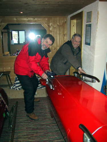 Rupert und Edi schleifen die Kufen des Viererbobs von Lettland 2. Ob´s was half?