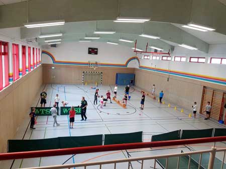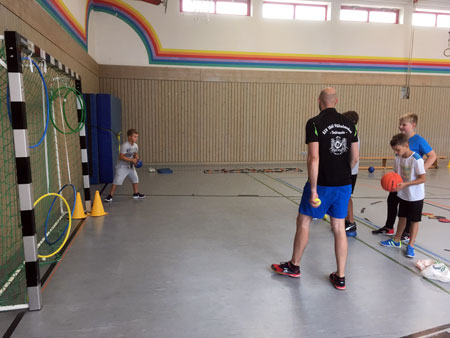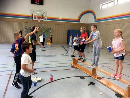 Ein Highlight war sicher die „Schneeballschlacht“ zum Schluss, bei der die Kinder in zwei Gruppen versuchen mussten, so viele Bälle wie möglich in das Feld der anderen Gruppe zu schmettern, zu schupfen oder zu blocken.