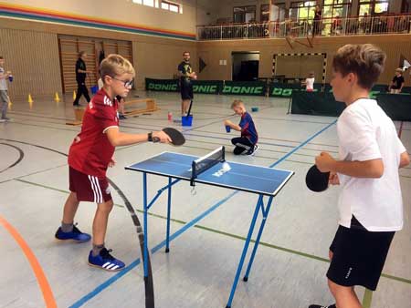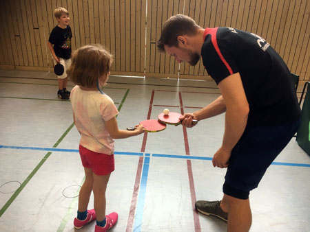 Dem herzlichen Willkommensgruß der Jugendleiterin Ingrid Kleber folgte ein erstes Schmankerl, der „Schaukampf“ zweier Führungsspieler der ersten von insgesamt vier Herrenmannschaften. Danach führte Lukas Seibold, stellvertretender Jugendleiter, durch das abwechslungsreiche Programm, beginnend mit einer Aufwärmrunde, um Muskeln und Sehnen auf Touren zu bringen. Die 15 Teilnehmer:innen, im Alter zwischen 7 und 11 Jahren wurden anschließend in Gruppen aufgeteilt und durften sich an insgesamt vier verschiedenen Stationen mit unterschiedlichen Schwerpunkten austoben. Eltern und Großeltern konnten dem Geschehen bei Kaffee und Kuchen von der Tribüne aus folgen. Neben einem Geschicklichkeitsparcours, bei dem es mit dem Ball auf dem Schläger einige Hindernisse zu überwinden und zu umkurven galt, erfreute sich vor allem das Zielwerfen auf aufgehängte Reifen mit unterschiedlichen Bällen (Tischtennis, Tennis, Badminton, Basketball …) großer Beliebtheit. Auch die Mini-Tischtennisplatte und das freie Spiel über einige Banden lieferten gleichermaßen sehenswerte und für die Kinder amüsante Ballwechsel. Neben den Jugendleitern und den beiden Spielern der Herrenmannschaft wurden die jungen Wilden von Gabor Mohai, dem A-Lizenztrainer in Wilhelmsdorf, durch das Programm begleitet.