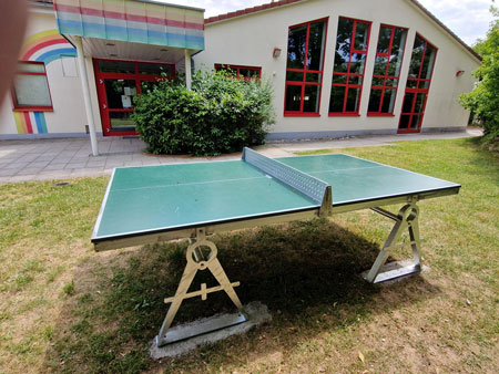 Unsere Tischtennis-Außenplatte wurde direkt vor dem Eingang der Hugenottenhalle aufgestellt.